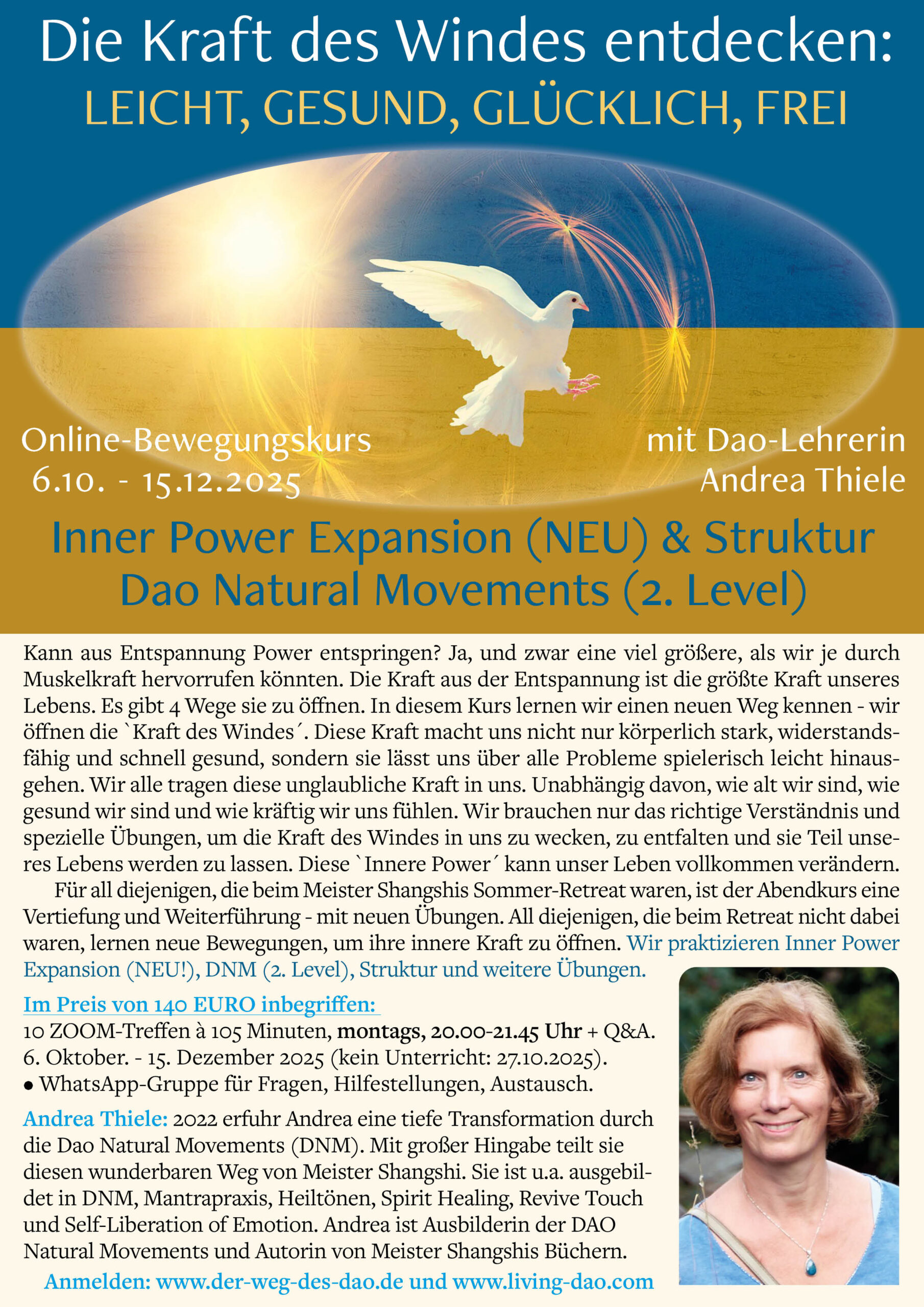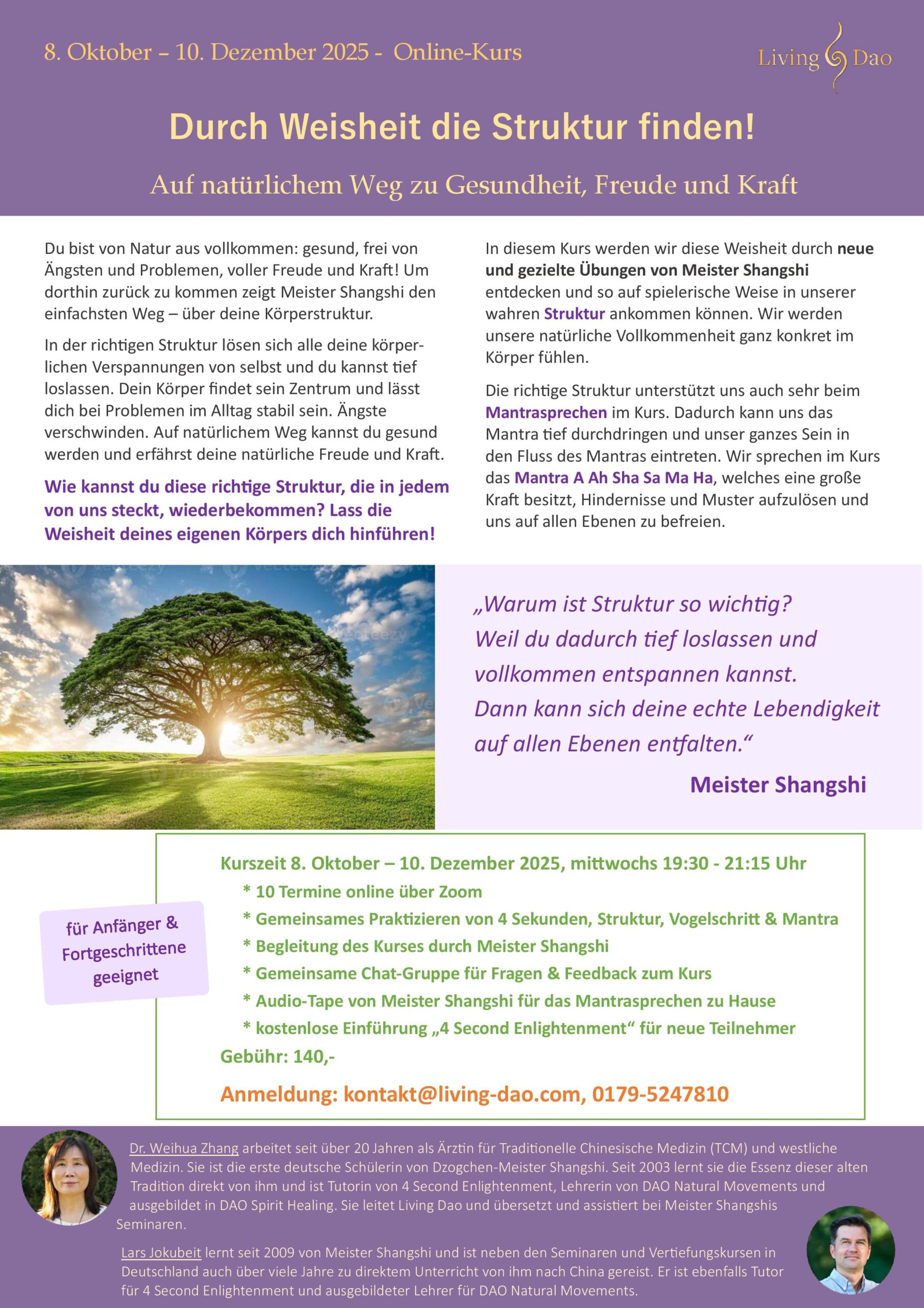 Zum Kennenlernen von Meister Shangshis Weg geben seine langjährigen Schülerinnen Weihua Zhang und Andrea Thiele Einführungsseminare, in denen sie das grundlegende Wissen und die Basis-Praktiken des Dzogchen und des Living Dao vermitteln. In ihren Abendkursen vermitteln sie die einzigartige `4 Second Enlightenment Methode´, die DAO Natural Movements, Mantren und Heilungsmethoden des Living Dao.